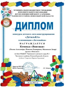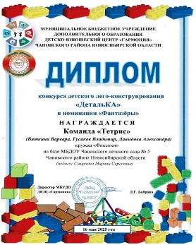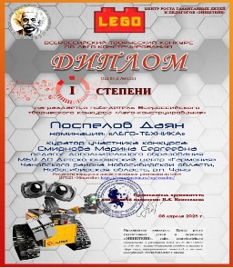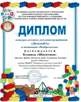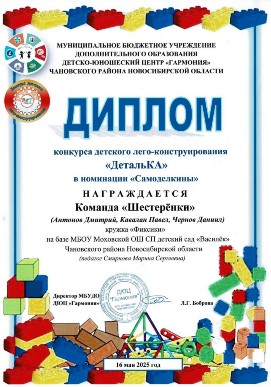 2024-2025 учебный год Название мероприятия Фамилия, имя участника Результат Всероссийский творческий конкурс «Лего-конструирование» (08.04.2025г.) Поспелов Даян Диплом 1 степени в номинации «Лего-конструирование» Конкурс детского лего-конструирования «ДетальКА» (16.05.2025г.) Кружок «Фиксики» (Антонов Дмитрий, Кавалан Павел, Чернов Даниил) Диплом в номинации «Самоделкины» Конкурс детского лего-конструирования «ДетальКА» (16.05.2025г.) Кружок «Фиксики» (Лосева Алекссандра, Попкова Екатерина, Маханьков Захар) Диплом в номинации «Легознайки» Конкурс детского лего-конструирования «ДетальКА» (16.05.2025г.) Кружок «Фиксики» (Герлингер Софья, Гергель Александр, Куц Вероника) Диплом в номинации «Юные конструкторы» Конкурс детского лего-конструирования «ДетальКА» (16.05.2025г.) Кружок «Фиксики» (Вяткина Варвара, Гусаков Владимир, Давыдова Александра) Диплом в номинации «Фантазёры» Конкурс детского лего-конструирования «ДетальКА» (16.05.2025г.) Кружок «Фиксики» (Килинг Артём, Поспелов Даян, Ульданова Эвелина) Диплом в номинации «Изобретатели»