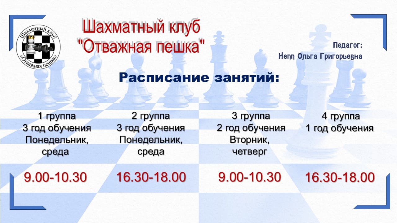 Расписание шахматного клуба "Отважная пешка"