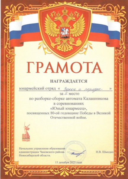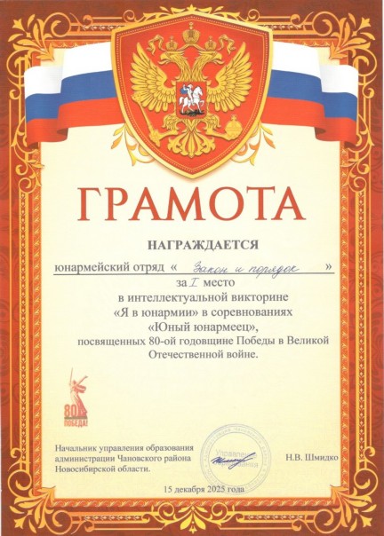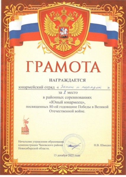 15 декабря на базе Чановской средней школы № 2 прошли районные соревнования «Юный юнармеец», посвящённые 80 й годовщине Победы в Великой Отечественной войне. В состязаниях приняла участие команда Школы гражданско правового воспитания «Закон и порядок» Детско-юношеского центра «Гармония» (на базе Новопреображенской средней школы). Всего в конкурсе соревновались 100 юнармейцев — представители 20 отрядов (по 5 человек в каждом). Цель мероприятия — выявить самых активных, успешных и эрудированных юнармейцев в возрастной категории 7–12 лет, а также укрепить понимание ребятами своей роли как граждан России: важности патриотизма, готовности защищать Родину и жить её интересами. Честь школы отстаивали: • Биксиитова Дарина; • Ибрагимов Альберт; • Терентьев Иван; • Уразаев Данияр; • Уйван Даниль. Программа соревнований включала несколько этапов: • интеллектуальный этап; • снаряжение магазина АК (на время); • разборка и сборка автомата Калашникова (на время); • стрельба из лазерного автомата. Итоги выступления команды «Закон и порядок»: • 1 е место в интеллектуальной викторине «Я в юнармии»; • 3 е место в общекомандном зачёте по разборке и сборке автомата Калашникова; • ПОБЕДА (1-е место) в районных соревнованиях во 2 й группе. Поздравляем ребят с достойным результатом! Желаем не останавливаться на достигнутом, сохранять боевой дух и добиваться новых высот. Пусть эти соревнования станут ещё одной ступенькой к большим победам!